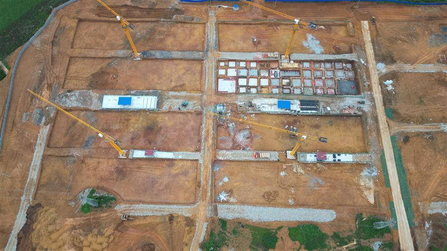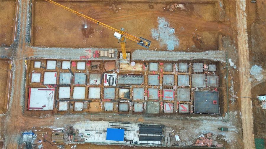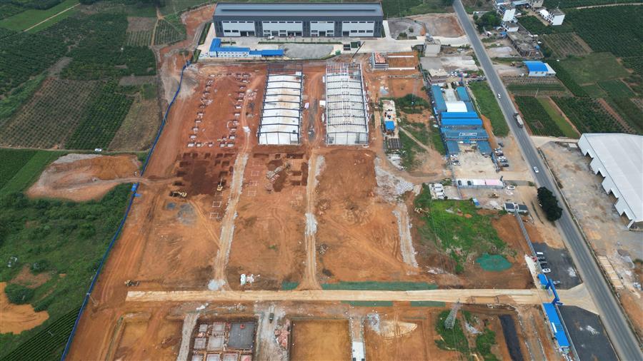 目前,該項(xiàng)目設(shè)備房消防水池外架搭設(shè)、模板安裝已完成,4號(hào)廠房側(cè)面檁條安裝完成,5號(hào)廠房屋面檁條安裝完成50%,6號(hào)樓基礎(chǔ)承臺(tái)已完成,4號(hào)樓地基處理注漿完成70%等。