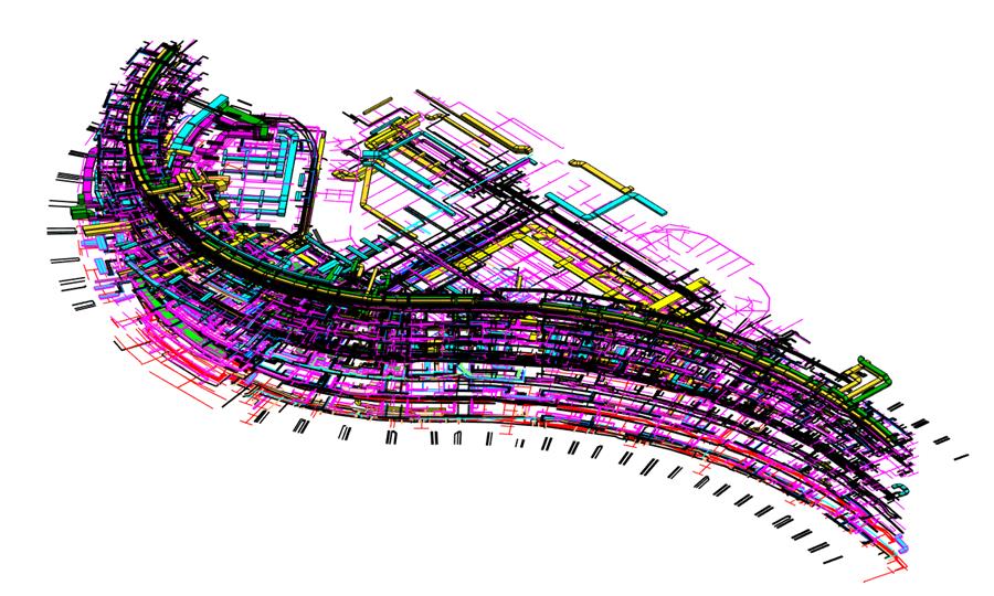 其中BIM機(jī)電深化設(shè)計(jì)為項(xiàng)目帶來(lái)了巨大的經(jīng)濟(jì)效益。通過(guò)建立BIM模型,在模型中進(jìn)行管線綜合排布、凈高優(yōu)化、機(jī)房深化設(shè)計(jì)等,發(fā)現(xiàn)并解決設(shè)計(jì)圖紙中存在的錯(cuò)誤,然后進(jìn)行碰撞檢查,優(yōu)化管線走向,提高樓層凈高,最終導(dǎo)出深化后的BIM模型與CAD圖紙,兩者相結(jié)合對(duì)現(xiàn)場(chǎng)施工人員進(jìn)行交底,指導(dǎo)現(xiàn)場(chǎng)施工。