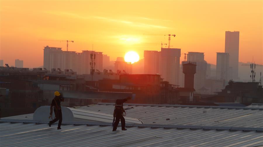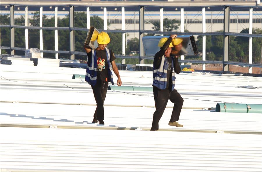 7月25日清晨,在廣西柳州柳工集團(tuán)柳工裝載機(jī)燈塔工廠項目工地,工人在屋面施工。