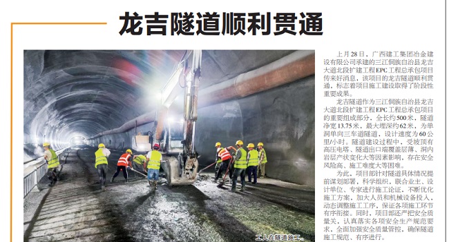 1月2日,《柳州日報》要聞版報道冶建公司桂海分公司承建的三江縣龍吉大道北段擴(kuò)建工程,龍吉隧道順利貫通,項(xiàng)目建設(shè)取得階段性重要成果。