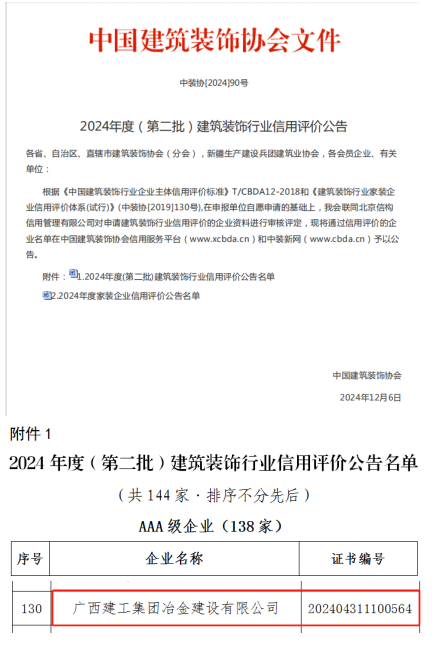 12月6日,中國建筑裝飾協(xié)會發(fā)布2024年度(第二批)建筑裝飾行業(yè)信用評價公告,冶建公司獲評為“建筑裝飾行業(yè)信用AAA企業(yè)”。這是公司連續(xù)12年獲此殊榮。