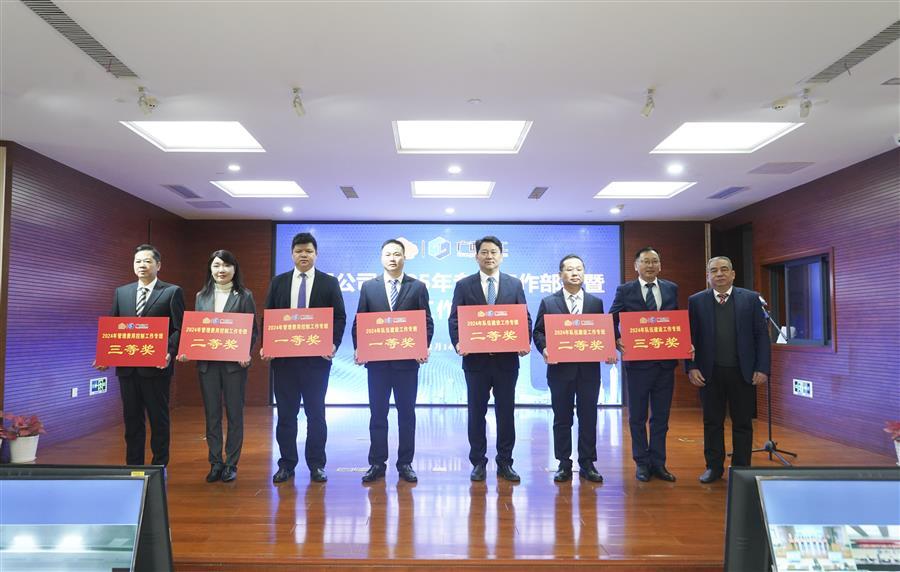 公司董事長、黨委書記覃振華(右三)上臺(tái)領(lǐng)取2024年隊(duì)伍建設(shè)工作專班獎(jiǎng),公司總經(jīng)理、黨委副書記蒙勝益(左一)上臺(tái)領(lǐng)取2024年管理費(fèi)用控制工作專班獎(jiǎng)