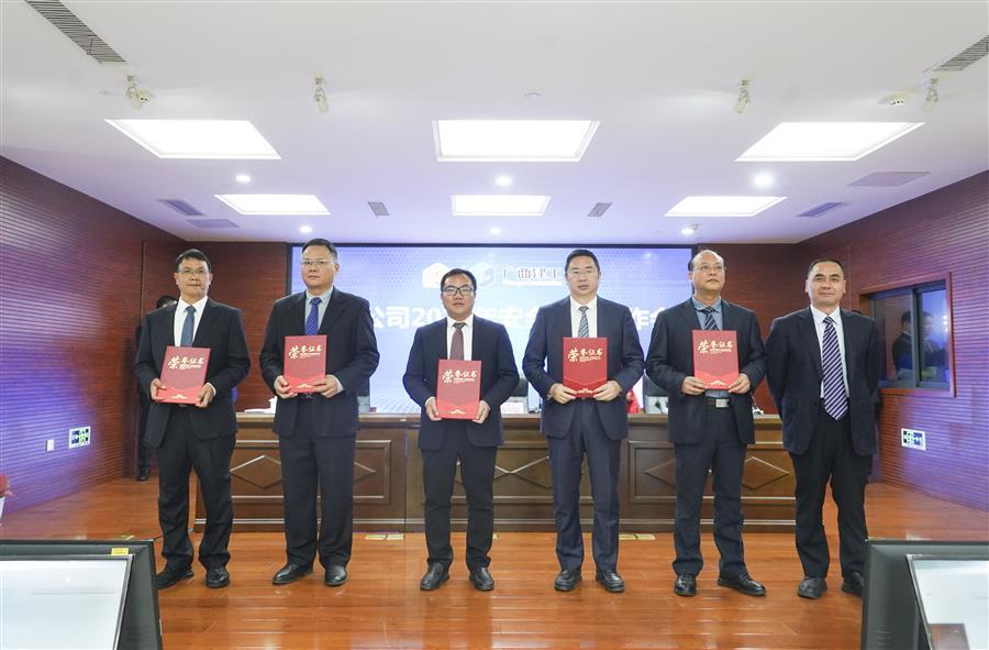 公司董事長、黨委書記覃振華(右三)上臺(tái)領(lǐng)取優(yōu)秀經(jīng)營單位獎(jiǎng)