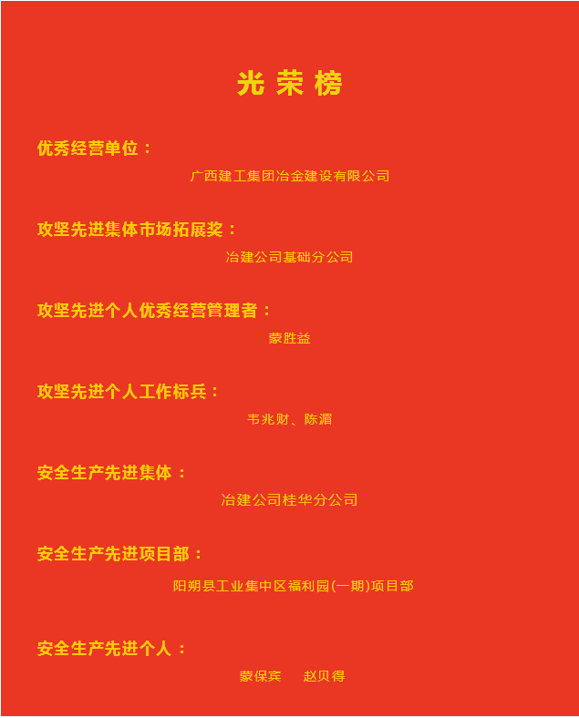 2 月 14 日,廣西建工集團(tuán)有限責(zé)任公司 2025 年專班工作部署暨重點(diǎn)工作推進(jìn)會(huì)、安全生產(chǎn)工作會(huì)、黨建工作會(huì)等系列會(huì)議在南寧召開。會(huì)議表彰了2024年度先進(jìn)集體和先進(jìn)個(gè)人,冶建公司榮獲多項(xiàng)集體和個(gè)人榮譽(yù)。