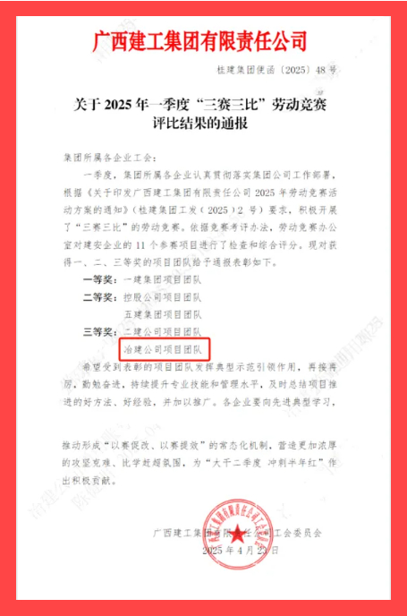 4月23日,集團(tuán)公司工會(huì)通報(bào)2025年一季度“三賽三比”勞動(dòng)競(jìng)賽評(píng)比結(jié)果,冶建公司項(xiàng)目團(tuán)隊(duì)在11個(gè)建安企業(yè)參賽項(xiàng)目中榮獲三等獎(jiǎng),彰顯了項(xiàng)目團(tuán)隊(duì)務(wù)實(shí)高效、團(tuán)結(jié)協(xié)作、拼搏進(jìn)取的精神風(fēng)貌。