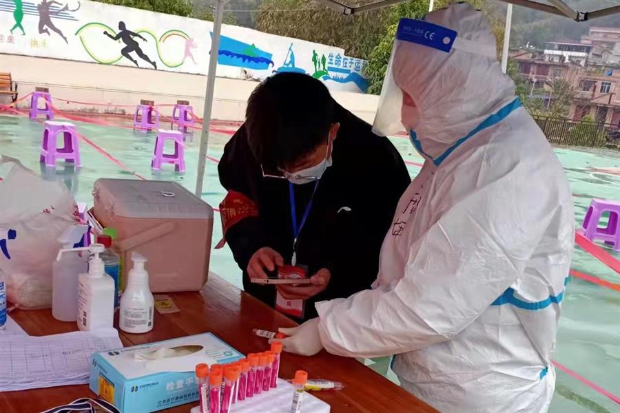 2月7日,阮斌在百色市田東縣印茶鎮(zhèn)那板村六內(nèi)屯青年志愿者隊參加志愿者工作。他每天除了協(xié)助醫(yī)務(wù)人員進行核酸檢測,還要與其他志愿者在村口站崗,仔細檢查每一位村民的兩碼并測量體溫。遇到不配合工作的老人,他還會耐心解釋當前疫情防控政策,勸說他們不要離鄉(xiāng)走動,配合防疫工作人員做好疫情防控工作。不站崗時,阮斌會和其他青年志愿者一起上門宣傳疫情防護知識,幫助村民做核酸檢測前的信息錄入。有些老人不會使用手機,阮斌便耐心將操作流程演示給老人看,再讓老人自行操作一次,遇到老人忘記操作的步驟時,阮斌會一次又一次地演示,直到老人可以記住全部操作流程。