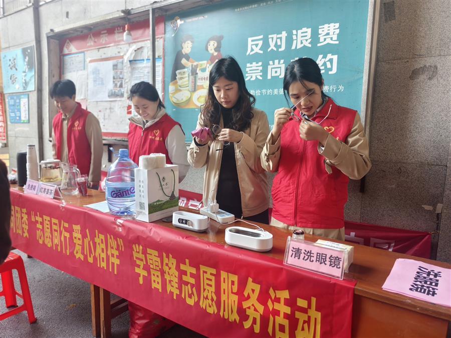 活動(dòng)現(xiàn)場(chǎng),志愿者們?yōu)樯鐓^(qū)居民提供清洗眼鏡、贈(zèng)送紅棗姜茶、清除小廣告、防詐宣傳等志愿服務(wù),為社區(qū)居民送去溫暖與便利。