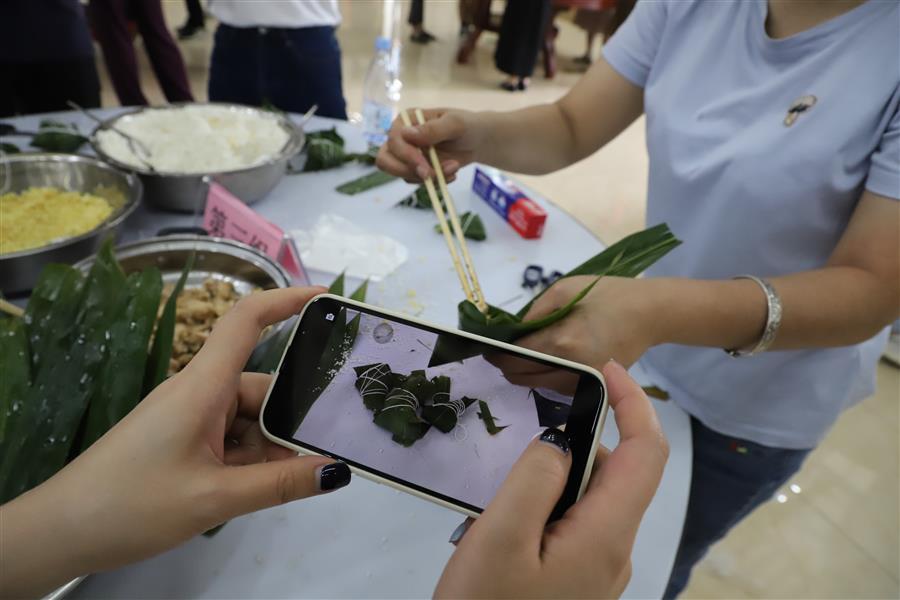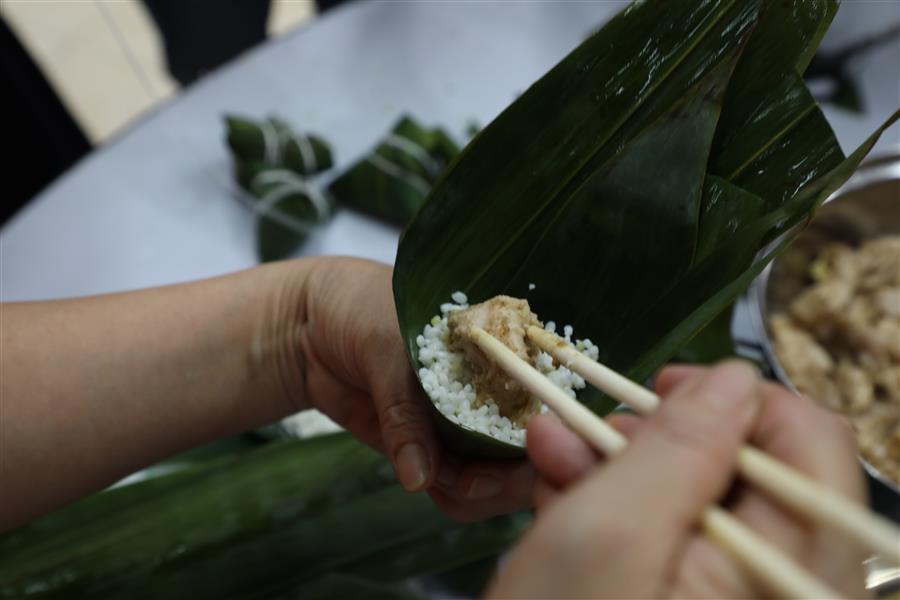 經(jīng)過簡單的現(xiàn)場教學后,大家領取材料,分組配合,踴躍參與包粽子比賽,只見大家捋粽葉、放餡、封口、扎捆,動作一氣呵成,不一會兒,一只只各式各樣的粽子就在大家手中成型。
